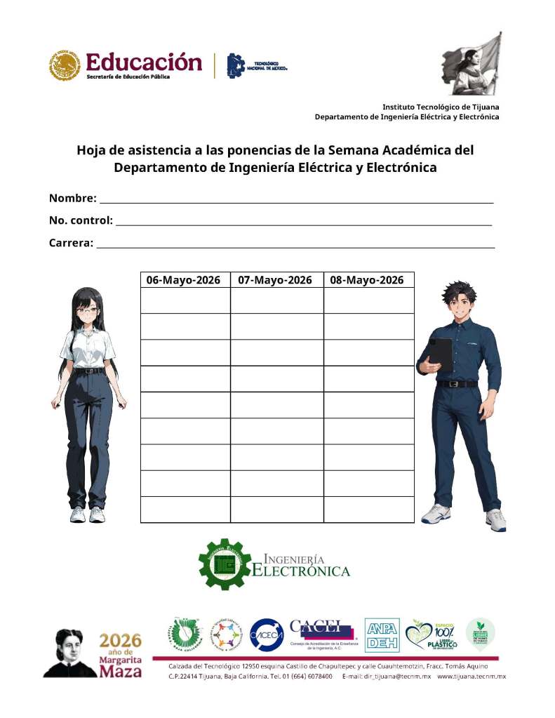 La semana académica del Departamento de Ingeniería Eléctrica y Electrónica (DIEE) se llevará a cabo del 06 al 08 de mayo de 2026 y tiene como propósito fomentar un espacio académico y formativo que complemente la educación de los estudiantes mediante conferencias, talleres y actividades interdisciplinarias. Se busca promover la actualización de conocimientos, el intercambio de ideas y la vinculación con temas de innovación, investigación y experiencias de egresados en el ámbito de su ejercicio profesional.